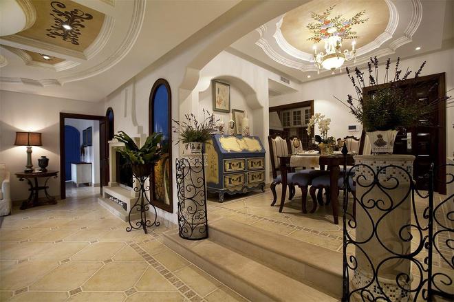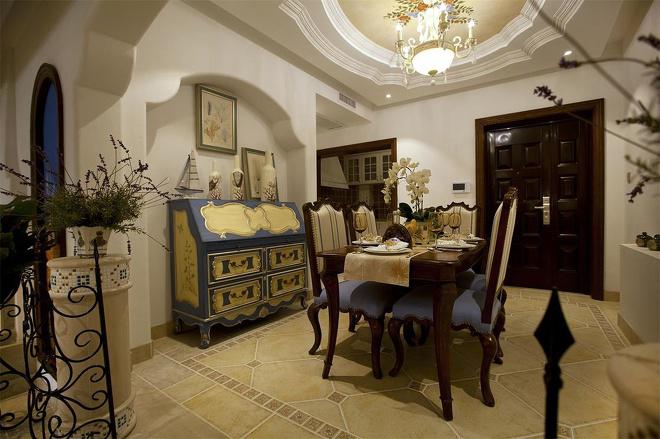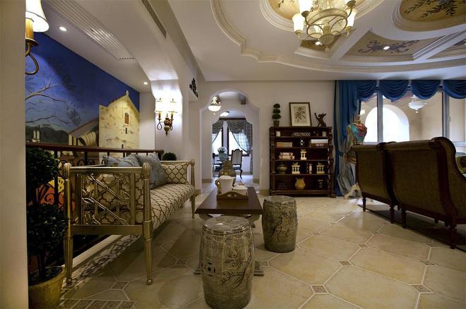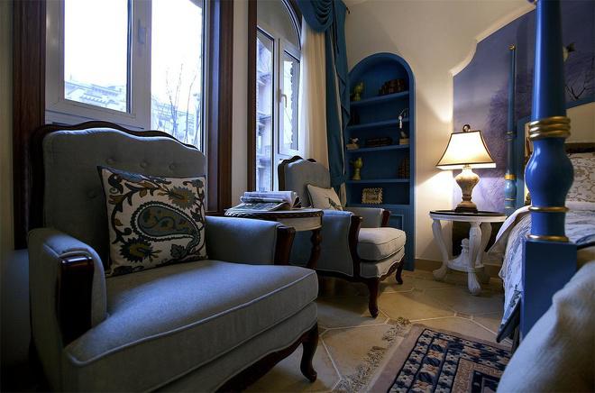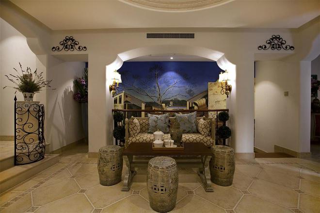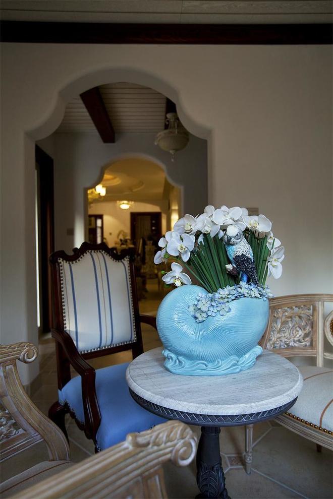 推門(mén)而入,普利亞南部薰衣草飄來(lái)的藍(lán)紫色香氣芬芳馥郁。海與天明亮的色彩干凈清爽,自然清新的玄關(guān),色彩淺淡的地板和淡色的墻壁相呼應(yīng)。客廳中充斥著拱門(mén)和馬蹄狀的造型,家具也以藍(lán)色以及木色為主色調(diào),且多是線條簡(jiǎn)單修邊渾圓的木質(zhì)家具。部分家具特意擦淡做舊,表現(xiàn)出自然清新的感覺(jué)。