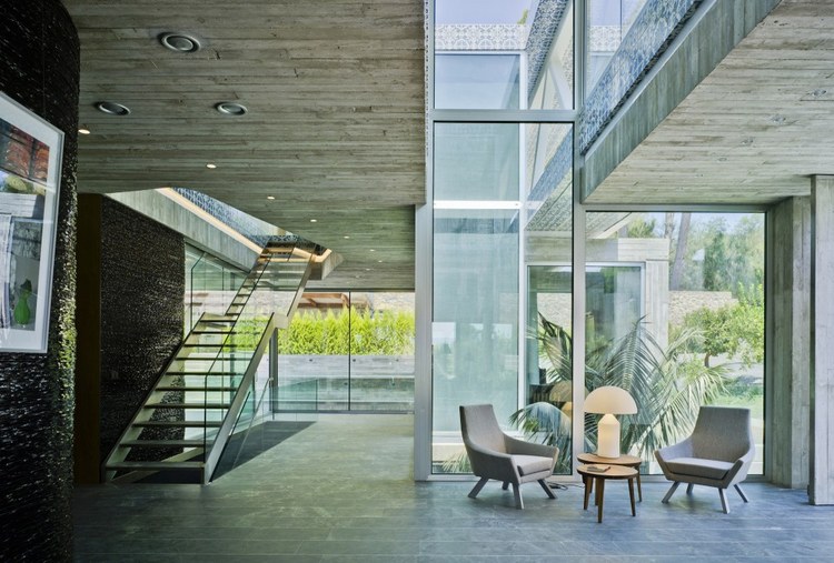 1.舒適性體驗(yàn) 地下室內(nèi)部映照著一定的自然光可以滿足休閑娛樂所用。趣味從停車庫開始,透過這里的后擋風(fēng)玻璃窗設(shè)計(jì)可以看見游泳池;由彩色模壓混凝土鋪筑成的人行道加強(qiáng)了房間與室外區(qū)域的聯(lián)系; 2.居住性體驗(yàn) 一層包括一個(gè)C形區(qū)域并向私人開放向空間敞開。巨大的懸臂頂棚將內(nèi)外區(qū)域連接起來,家人可以在這里聽音樂、看展覽。