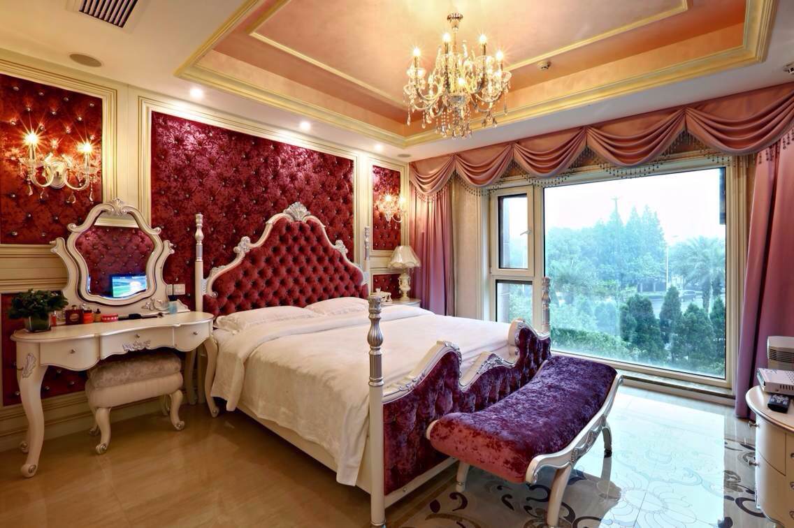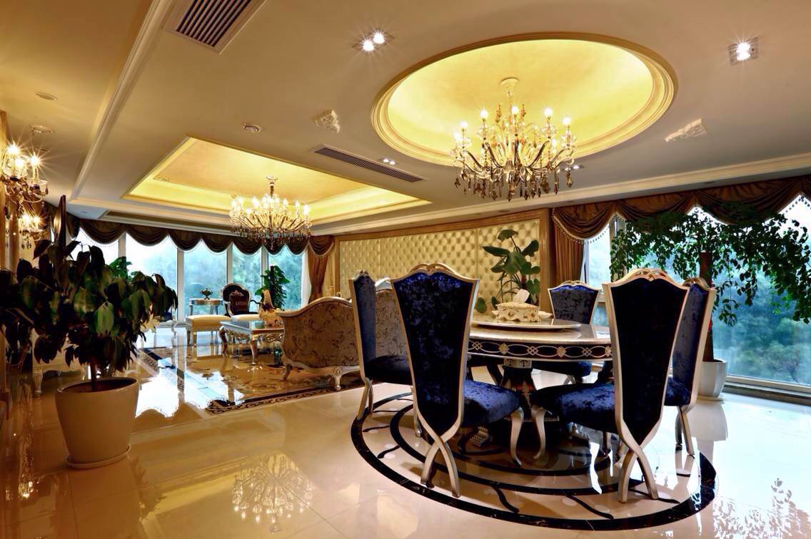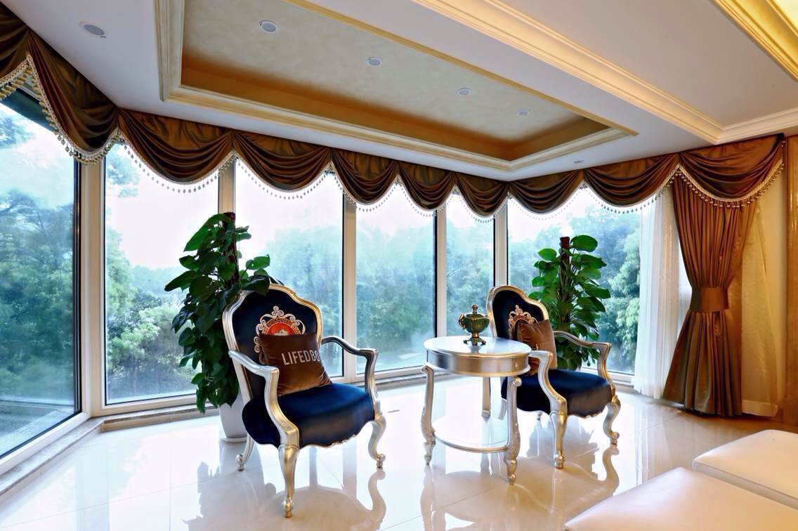 餐廳秉持典型的法式風(fēng)格搭配原則,餐桌和餐椅均為米白色,表面略帶雕花,配合扶手和椅腿的弧形曲度,顯得優(yōu)雅矜貴,而在白色的卷草紋窗簾、水晶吊燈、落地?zé)簟⑵坎灏俸匣ǖ拇钆湎?,浪漫清新之感撲面而?
