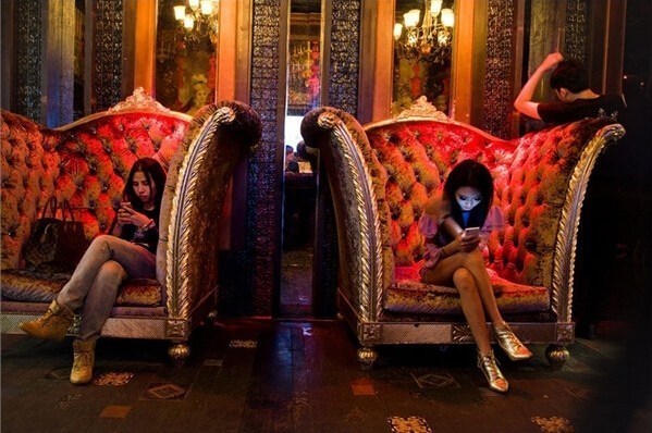 上海,一家夜總會入口處,坐在沙發(fā)上等待的女孩們。