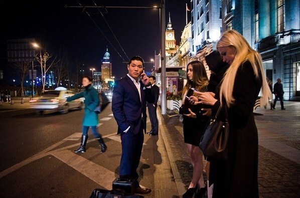 30歲的K·P·Yue與幾名外國女友一起在外灘等出租車。
