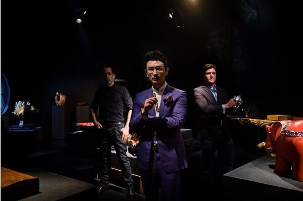 中國企業(yè)家塔羅斯(中)與他的兩名雇員——來自英國的托比·柯林斯(右)和來自美國的梅爾斯在工作室內(nèi)合影。