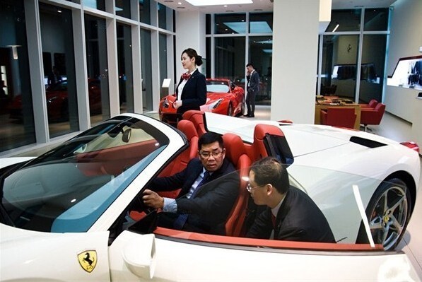 浦東世紀(jì)大道一間豪車展廳內(nèi),一位男士試駕報價450萬人民幣的法拉利458 Spider。